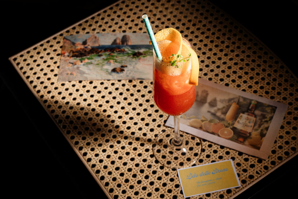 Per raccontarne l’essenza, Lalita si è ispirata ad un aneddoto di fantasia ambientato nel 1963 al Lido delle Sirene, un angolo di paradiso di fronte ai maestosi Faraglioni di Capri: la storia immaginaria di Loretta, barlady ‘visionaria’ capace di creare un cocktail, anzi un ‘capolavoro di equilibrio’, dove le note complesse di Amaro Montenegro si fondono con la freschezza esplosiva del limone di Capri. Protagonista assoluto della ricetta è infatti Amaro Montenegro, trasformato in una rinfrescante versione frozen grazie all’uso di un allora avveniristico frullatore cromato. Il segreto risiede nell’infusione delle bucce di limone di Capri, che esaltano le note dell’amaro, bilanciandole con spremute fresche e un tocco di dolcezza. Servito con una cannuccia colorata in eleganti flûtes da Champagne, all’epoca simbolo di prestigio, il “Ghiacciato al Sole” è stato accompagnato da sonorità jukebox per restituire intatto il fascino della Dolce Vita in un solo sorso.